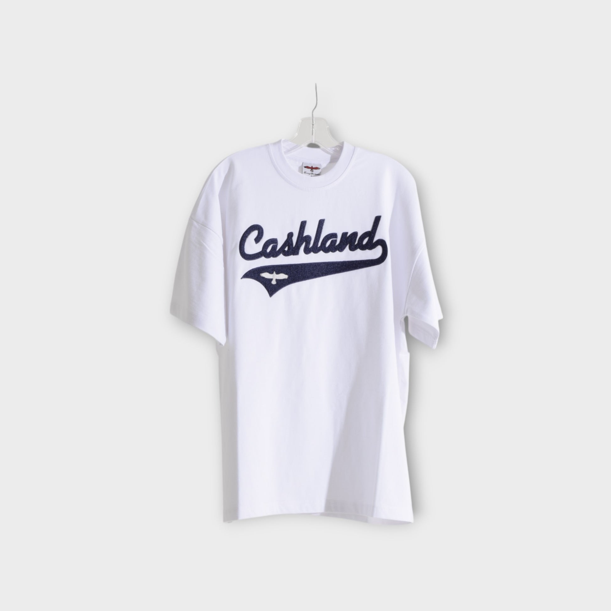 - Navy Chenille Logo on White Shirt